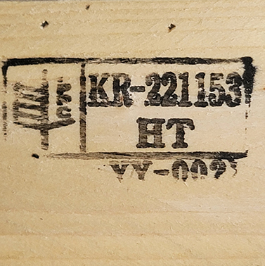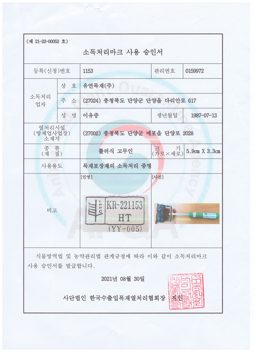 또한 열처리작업을 마친 자재는 허가받은 소독처리마크를 찍어 줍니다.